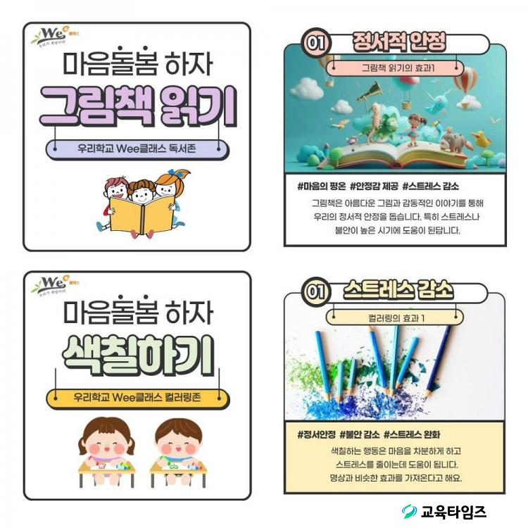 Çлý Á¤¼Áö¿ø Ȱµ¿Àº ÇлýµéÀÌ ±³°ú ¿Ü ½Ã°£À» Ȱ¿ëÇÏ¿© ´©±¸¶óµµ ½±°Ô ¸¶À½Ã¬±èÀ» Á÷Á¢ üÇèÇØ º¸°í, Ä£±¸°ü°è¿¡¼ Ȱ¿ëÇÒ ¼ö ÀÖ´Â »çȸ±â¼úÀ» ÇнÀÇÒ ¼ö ÀÖµµ·Ï ±¸¼ºÇÏ¿´´Ù. ¼¼ºÎÀûÀΠȰµ¿ ³»¿ëÀ¸·Î´Â ù°, Çб³ ³»¿¡ ÇÑ °ø°£À» ¸¶À½Ã¬±èÁ¸(zone)À¸·Î ÁöÁ¤ÇÏ¿© ¿î¿µÇÏ´Â ÇÁ·Î±×·¥ÀÌ´Ù. ¸¶À½Ã¬±èÁ¸(zone)Àº µ¶¼Á¸, ¿îµ¿Á¸, Ä÷¯¸µÁ¸ µîÀÇ È°µ¿À¸·Î ÇлýµéÀÌ Áö±Ý ¿©±â¿¡ ÁÖÀǸ¦ ÁýÁßÇÏ´Â ¸¶À½Ã¬±è¿¡ ½±°Ô ´Ù°¡°¡µµ·Ï ÇÏ¿´´Ù. µÑ°, »õ Çбâ Ä£±¸°ü°è¿¡¼ ÇÊ¿äÇÑ »çȸ±â¼úÀ» À§ÇÑ ¡®#±×¶© À̸»¡¯Ã§¸°Áö Ȱµ¿ÀÌ´Ù. ÇлýµéÀÌ Ä£±¸¸¦ »ç±Í°Å³ª, ¼¸ÔÇØÁø Ä£±¸¿ÍÀÇ °ü°è°³¼±À» À§ÇØ °Ç³Ú ¼ö ÀÖ´Â ¸»µéÀ» ³ª´©´Â Ȱµ¿À¸·Î °Ç°ÇÑ °ü°è¸¦ ¸Î°í À¯ÁöÇÒ ¼ö ÀÖ´Â ±âȸ¸¦ Á¦°øÇÑ´Ù. ¼Â°, ÇлýµéÀÇ Âü¿©¸¦ ³ôÀÏ ¼ö ÀÖµµ·Ï ¡®¸¶À½Ã¬±è ¹Ì¼Ç Ȱµ¿Áö¡¯¸¦ Ȱ¿ëÇÏ¿© ÇлýµéÀÇ Âü¿©µ¿±â¸¦ ³ôÀδٴ Àü·«ÀÌ´Ù. ¸¶Áö¸·À¸·Î »ó´ãÁÖ°£ °øµ¿ Çö¼ö¸· °Ô½Ã¿Í Çб³ »ó´ã ¼ºñ½º È«º¸ ¾Ë¸²À» ÅëÇØ Çлý°ú º¸È£ÀÚ°¡ ½±°Ô »ó´ã½Ç¿¡ ´Ù°¡¿Ã ¼ö ÀÖµµ·Ï ¹®ÅÎÀ» ³·Ãè´Ù.