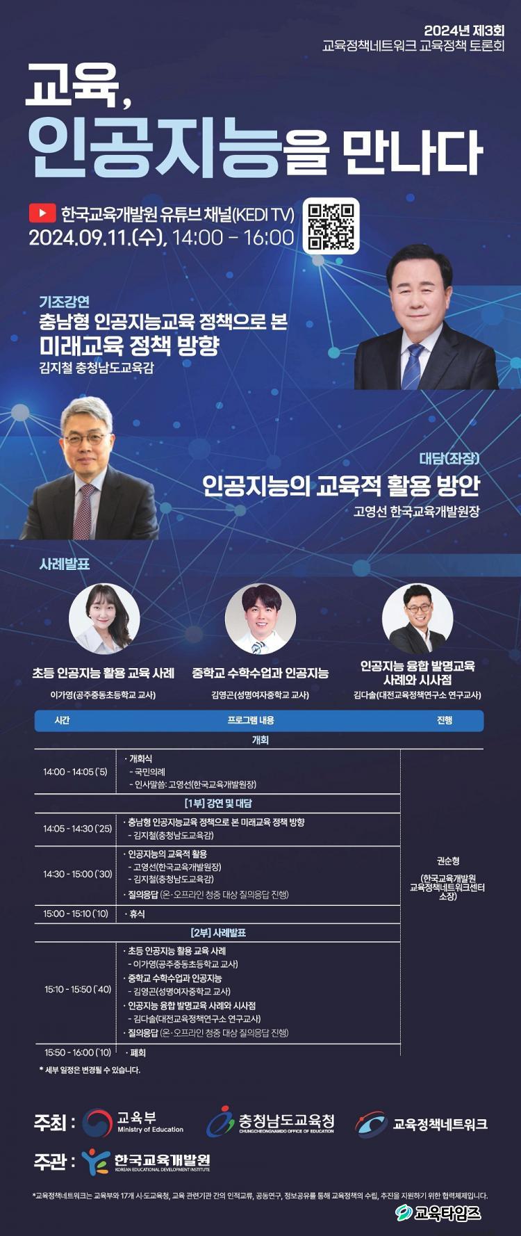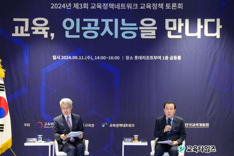 [±³À°Å¸ÀÓÁî/Ãæ³²±³À°] °¡µÎÈ£ ±âÀÚ = Ãæ³²±³À°Ã»(±³À°°¨ ±èÁöö)Àº 9¿ù 11ÀÏ(¼ö) ºÎ¿© ·Ôµ¥¸®Á¶Æ®¿¡¼ ¡®±³À°, ÀΰøÁö´ÉÀ» ¸¸³ª´Ù¡¯¸¦ ÁÖÁ¦·Î ¡®2024³â Á¦3ȸ ±³À°Á¤Ã¥³×Æ®¿öÅ© ±³À°Á¤Ã¥ Åä·Ðȸ¡¯¿¡ Âü¼®ÇÏ¿´´Ù. À̹ø Åä·Ðȸ´Â ±³À°ºÎ¿Í 17°³ ½Ã¤ýµµ±³À°Ã», Çѱ¹±³À°°³¹ß¿ø ¿Ü 8°³ ±³À°°ü°è±â°ü ±³À°Á¤Ã¥³×Æ®¿öÅ© Âü¿© ±³À°°ü°è±â°ü: Çѱ¹±³À°°³¹ß¿ø, Çѱ¹±³À°°úÁ¤Æò°¡¿ø, Çѱ¹Á÷¾÷´É·Â¿¬±¸¿ø, Çѱ¹±³À°ÇмúÁ¤º¸¿ø, ±¹°¡Æò»ý±³À°ÁøÈï¿ø, Çѱ¹±³À°¹æ¼Û°ø»ç, Çѱ¹°úÇÐâÀÇÀç´Ü, Çѱ¹Ã»¼Ò³âÁ¤Ã¥¿¬±¸¿ø, À°¾ÆÁ¤Ã¥¿¬±¸¼Ò