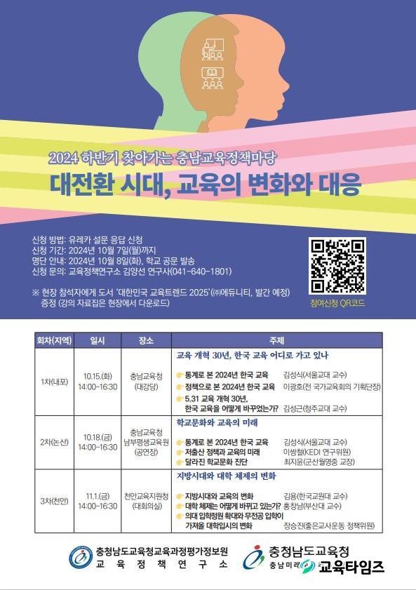 [±³À°Å¸ÀÓÁî/Ãæ³²±³À°] °¡µÎÈ£ ±âÀÚ = Ãæ³²±³À°Ã»(±³À°°¨ ±èÁöö) Ãæ³²¹Ì·¡±³À°ÃßÁø¼¾ÅÍ¿Í ±³À°°úÁ¤Æò°¡Á¤º¸¿ø(¿øÀå ¹è¹«·æ) ±³À°Á¤Ã¥¿¬±¸¼Ò°¡ 10¿ù°ú 11¿ù µÎ ´Þ µ¿¾È ³»Æ÷, ³í»ê, õ¾È ¼¼ °÷¿¡¼ ¡°´ëÀüȯ ½Ã´ë, ±³À°ÀÇ º¯È¿Í ´ëÀÀ¡±À̶õ ´ëÁÖÁ¦·Î ÇϹݱâ ã¾Æ°¡´Â Ãæ³²±³À°Á¤Ã¥¸¶´çÀ» °³ÃÖÇÑ´Ù.