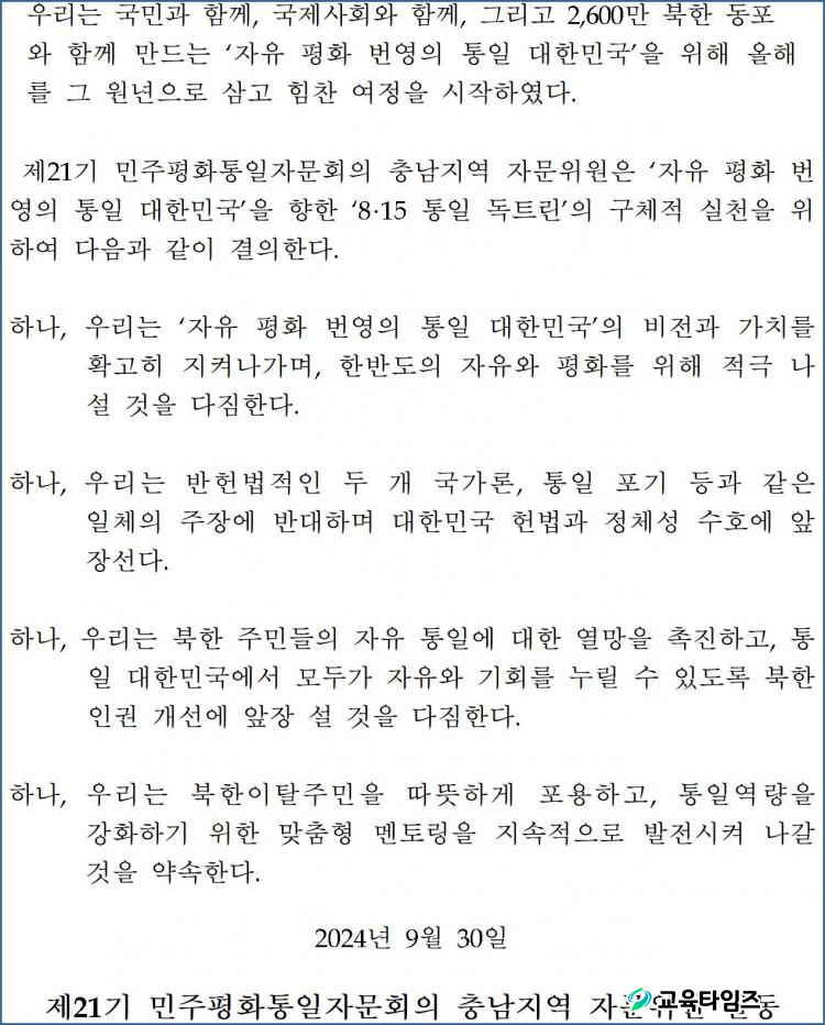 ȸÀǸ¦ ¸¶¹«¸®Çϸç Ãæ³²Áö¿ª ÀÚ¹®À§¿øµéÀº ±¹¹Î°ú ÇÔ²²ÇÏ´Â ÀÚÀ¯¹ÎÁÖÁÖÀÇ ±â¹Ý ÅëÀÏÁغñ¿Í ¡®8‧15 ÅëÀÏ µ¶Æ®¸°¡¯ ½ÇÇöÀ» À§ÇÑ ÀÇÁö¸¦ °áÁýÇÏ´Â ¡®ÀÚÀ¯ ÆòÈ ¹ø¿µÀÇ ÅëÀÏ ´ëÇѹα¹À» À§ÇÑ °áÀǹ®¡¯À» äÅÃÇß´Ù.