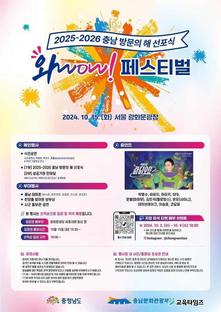 [±³À°Å¸ÀÓÁî/Ãæ³²] °¡µÎÈ£ ±âÀÚ = Ãæ³²µµ´Â ¿À´Â 15ÀÏ ¼¿ï ±¤È¹®±¤Àå¿¡¼ 2025-2026 Ãæ³² ¹æ¹®ÀÇ ÇØ ¼±Æ÷½Ä ¹× ¼º°ø ±â¿ø ÇѸ¶´ç ¡®¿Í¿ì Æä½ºÆ¼¹ú(¿ÍWOW! Æä½ºÆ¼¹ú)¡¯À» °³ÃÖÇÑ´Ù°í 13ÀÏ ¹àÇû´Ù.