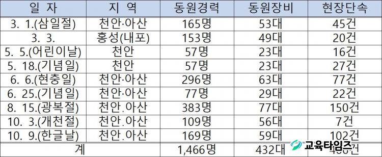 ±× °á°ú, ¿ÃÇØ »ïÀÏÀý(3.1.), ±¤ÁÖ¹ÎÁÖȿ±â³äÀÏ(5.18.), ÇöÃæÀÏ(6.6.), ±¤º¹Àý(8.15.), Çѱ۳¯(10.9.) µî ±¹°æÀÏ¿¡ ÃæÃ»³²µµ ÀÏ´ë¿¡¼ Ãâ¸ôÇÑ ÆøÁÖÁ·ÀÇ À§¹ýÇàÀ§ ÃÑ 466°Ç(Çü»çÀÔ°Ç 105°Ç(³Æø¡¤°øµ¿À§Çè 2°Ç, À½ÁÖ¿îÀü 38°Ç, ¹«¸éÇã 12°Ç, ÀÚ°ü¹ý 45°Ç, ÀÚ¼Õ¹ý 8), Åë°íóºÐ 281°Ç, ±âŸ(°úÅÂ·á µî) 80°Ç)À» ´Ü¼Ó(ÀÌ·ûÂ÷ 3´ë ¾Ð¼ö Æ÷ÇÔ)ÇÏ¿© Àü³âµµ ´Ü¼Ó ±Ô¸ð 113°ÇÀÇ ¾à 4¹è¸¦ ´Ü¼ÓÇÏ¿´À¸¸ç, ±× Áß SNS °øÁö±Û °Ô½Ã·Î 3. 3. ÆøÁÖÇàÀ§¸¦ ÁÖµµÇÑ 20´ë ³²ÀÚ 1¸íÀº »çÀ̹ö ÃßÀû ¼ö»ç¸¦ ÅëÇØ °øµ¿À§ÇèÇàÀ§·Î ¼ÛÄ¡ÇÏ¿´°í, 10. 9. Çѱ۳¯ ¾Æ»ê¿¡¼ ³Æø․°øµ¿À§ÇèÇàÀ§ ÇøÀÇ µîÀ¸·Î ÇöÇà¹ü üÆ÷µÈ 3¸í¿¡ ´ëÇØ¼µµ Çü»çó¹úÀ» ÁøÇà ÁßÀÌ´Ù.