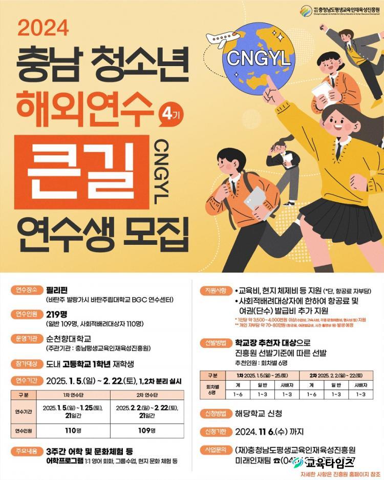 [±³À°Å¸ÀÓÁî/»çȸ] °¡µÎÈ£ ±âÀÚ = (Àç)ÃæÃ»³²µµÆò»ý±³À°ÀÎÀçÀ°¼ºÁøÈï¿ø(ÀÌ»çÀå ±èÅÂÈì, ÀÌÇÏ ÁøÈï¿ø)Àº 2024³â µ¿°è û¼Ò³â ÇØ¿Ü¿¬¼ö Âü°¡ÀÚ¸¦ 2024.10.21.(¿ù) ~ 11.6.(¼ö)±îÁö µµ³» °íµîÇб³ 1ÇгâÀ» ´ë»óÀ¸·Î °¢ Çб³¸¦ ÅëÇØ ¸ðÁýÇÑ´Ù°í ¹àÇû´Ù.