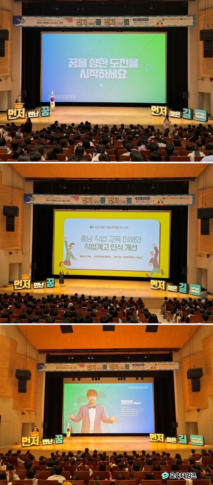 °¿¬Àº Ãæ³² Á÷¾÷°è°í ±³À°°úÁ¤¿¡ ´ëÇÑ ¾È³»¿Í ¸¶¼ú»ç ÃÖÇö¿ì °»çÀÇ Æ¯º°°¿¬À¸·Î ±¸¼ºµÆ´Ù. ÃÖÇö¿ì °»ç´Â ¡®Æí°ßÀ» ³Ñ¾î ²Þ°ú Èñ¸Á¿¡ ÁÖ¹®À» °É´Ù!¡¯¶ó´Â ÁÖÁ¦·Î Á÷¾÷±³À°¿¡ ´ëÇÑ ±àÁ¤Àû ÀνÄÀ» ½É¾îÁÖ°í Áø·ÎÀÇ °¡´É¼ºÀ» È®ÀåÇÏ´Â À̾߱⸦ ÀüÇß´Ù. °¿¬ ÈÄ¿¡´Â Çлýµé°ú ÇÔ²²ÇÏ´Â ¸¶¼ú °ø¿¬À» ÅëÇØ ¼ÒÅëÇϸç Á÷¾÷±³À°ÀÇ Àǹ̸¦ »õ·Ó°Ô Á¶¸íÇÏ´Â ½Ã°£À» °¡Á³´Ù.