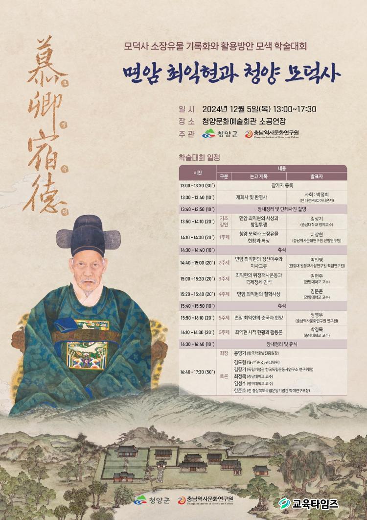[±³À°Å¸ÀÓÁî/»çȸ] °¡µÎÈ£ ±âÀÚ = Ãæ³²¿ª»ç¹®È¿¬±¸¿ø(¿øÀå ±è³«Áß)°ú û¾ç±º(±º¼ö ±èµ·°ï)ÀÌ °øµ¿À¸·Î ÁÖ°üÇÏ´Â ¸é¾Ï ÃÖÀÍÇö ¼±»ý ÀçÁ¶¸í Çмú´ëȸ°¡ ¿À´Â 2024³â 12¿ù 5ÀÏ(¸ñ) 13½Ã û¾ç¹®È¿¹¼úȸ°ü ¼Ò°ø¿¬Àå¿¡¼ °³ÃֵȴÙ.