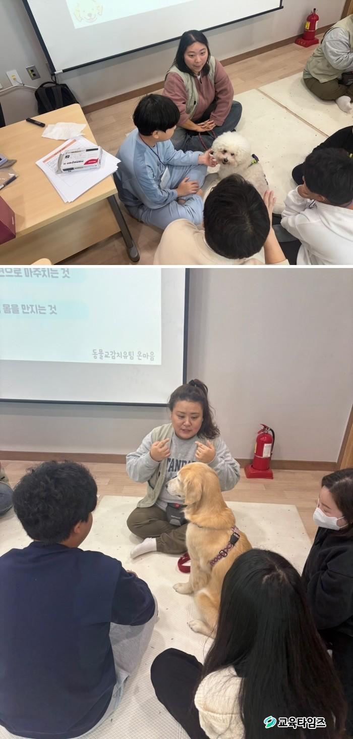 ÇлýµéÀº ¹Ý·Áµ¿¹°°ú ÇÔ²² ´Ù¾çÇÑ È°µ¿À» üÇèÇÏ¸ç ¸¶À½Ã¬±èÀ» ¿¬½ÀÇϰí, À̸¦ ÅëÇØ ÀÚ½ÅÀÇ °¨Á¤À» Â÷ºÐÈ÷ Á¤¸®ÇÏ´Â ½Ã°£À» °¡Á³´Ù. Âü¿©ÇÑ ÇÑ ÇлýÀº ¡°Æò¼Ò ÁÁ¾ÆÇÏ´ø ¹Ý·Áµ¿¹°°ú ÇÔ²² »ó´ãÀ» ¹ÞÀ¸¸ç ¾ÆÇ ¸¶À½ÀÌ È¸º¹µÇ´Â °ÍÀ» ´À²¼´Ù. ÀÌ·± ±âȸ°¡ ´õ ¸¹¾ÆÁ³À¸¸é ÁÁ°Ú´Ù¡±°í ¼Ò°¨À» ÀüÇß´Ù.