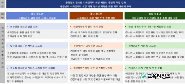 Á¦2Â÷ Á¾ÇÕ°èȹ¿¡¼´Â ÃæÃ»³²µµ û¼Ò³â »çȸ½É¸®Àû ¿Ü»ó Áö¿øÀÇ Áß½ÉÀû ¿ªÇÒ°È ¹× ¿Ü»ó ÇÇÇØ û¼Ò³â ȸº¹À» À§ÇÑ Áö¿ª »ýÅÂ°è ±¸ÃàÀ̶ó´Â ºñÁ¯À» Á¦½ÃÇÏ¿´´Ù. ¶ÇÇÑ Áß‧Àå±â Á¤Ã¥ ½ÇÇà°úÁ¦µéÀÇ ±ä±Þµµ, Á߿䵵, ³À̵µ¿¡ ´ëÇÑ Àü¹®°¡ 15ÀÎÀÇ Æò°¡°á°ú ºÐ¼®À» ÅëÇÏ¿© ¿ì¼±¼øÀ§ »ç¾÷°ú ¿¬Â÷º° ¼¼ºÎÃßÁø°úÁ¦ ¿î¿µ(¾È)À» µµÃâÇÏ¿´´Ù.