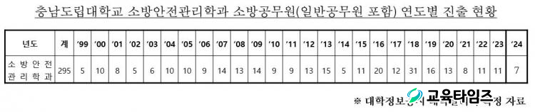 Ãæ³²µµ¸³´ëÇб³ ¼Ò¹æ¾ÈÀü°ü¸®Çаú¿¡ µû¸£¸é Áö³ÇØ Ãæ³² 5¸í, °æ±â 2¸í µî ÃÑ 7¸íÀÌ ¼Ò¹æ°ø¹«¿ø¿¡ ÀÓ¿ëµÆ´Ù. ÀÌ´Â °³±³ ÀÌ·¡ 295¸íÀ̸ç, Æò±Õ 30%ÀÇ ¼öÄ¡ÀÌ´Ù.