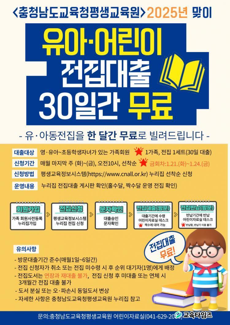 ¡¸À¯¾Æ¡¤¾î¸°ÀÌ ÀüÁý´ëÃâ ¼ºñ½º¡¹´Â Æò»ý±³À°¿ø °¡Á· ȸ¿øÀ¸·Î µî·ÏµÈ °¡Á¤¿¡ Ã¥ ²Ù·¯¹Ì ÇüÅ·ΠÀüÁý ÇÑ ÁúÀ» ÇÑ ´Þ°£ ´ëÃâ ÇØÁÖ´Â ÀÚ·á ÀÌ¿ë ¼ºñ½º´Ù. ÀüÁý ´ëÃâ ¼ºñ½º¸¦ Èñ¸ÁÇÏ´Â °¡Á¤Àº 1¿ù 21ÀÏ ¿ÀÀü 10½ÃºÎÅÍ Ãæ³²±³À°Ã»ÅëÇÕµµ¼°ü °¡Á·È¸¿øÀ¸·Î µî·ÏÇÏ°í Æò»ý±³À°Á¤º¸½Ã½ºÅÛ ´©¸®Áý¿¡¼ ¼±Âø¼øÀ¸·Î ½ÅûÇÏ¸é µÈ´Ù. ¶ÇÇÑ Ã¥ ¼ö·®ÀÌ ¸¹¾Æ ÀÌ¿ëÀÚ ÆíÀǸ¦ À§ÇØ Ã¥¼ö·¹¿Í ¹æ¼ö¹éµµ ÇÔ²² ÀÌ¿ëÇÒ ¼ö ÀÖµµ·Ï ÁغñµÇ¾î ÀÖ´Ù.