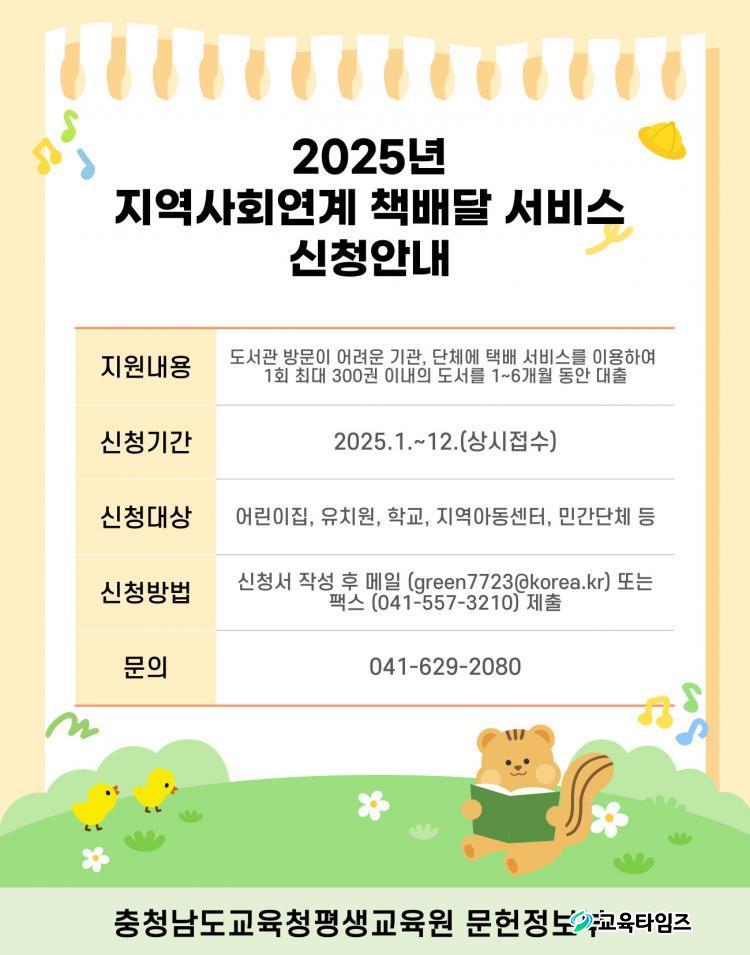 [±³À°Å¸ÀÓÁî/Ãæ³²±³À°] ¿ÀÁ¤ÀÏ ±âÀÚ = ÃæÃ»³²µµ±³À°Ã»Æò»ý±³À°¿ø(¿øÀå ÃÖº´¹¬)Àº °ü³» ¾î¸°ÀÌÁý¡¤À¯Ä¡¿ø¡¤Áö¿ª¾Æµ¿¼¾ÅÍ µîÀ» ´ë»óÀ¸·Î Ã¥ ¹è´Þ ¼ºñ½º¸¦ 2025³â 2¿ù 1ÀÏ(Åä)ºÎÅÍ ½ÃÀÛÇÑ´Ù.