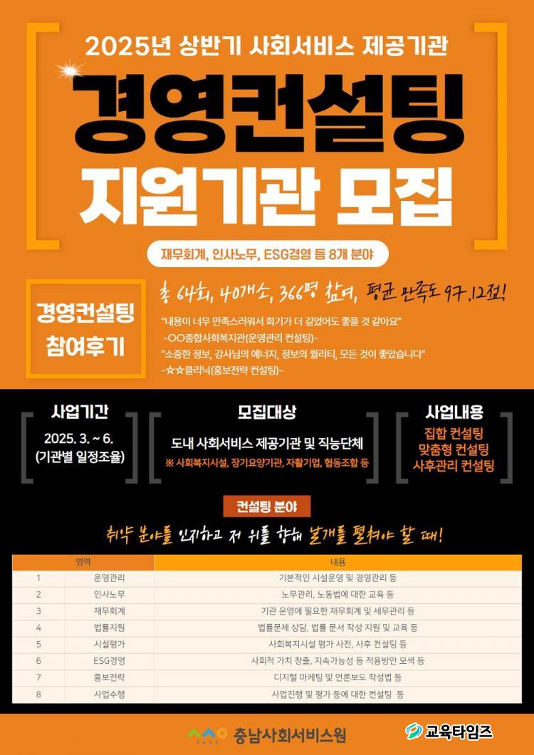 ½Åû±â°£Àº 3¿ù 4ÀϱîÁöÀ̸ç, ´ë»ó±â°üÀº Ãæ³² µµ³» »çȸ¼ºñ½º Á¦°ø±â°üÀÌ´Ù. À̹ø ÄÁ¼³ÆÃÀº Ư¼º°ú Çʿ信 µû¶ó ÁýÇÕ ÄÁ¼³ÆÃ, ¸ÂÃãÇü ÄÁ¼³ÆÃ, »çÈİü¸® ÄÁ¼³ÆÃÀ¸·Î ³ª´µ¾î ÁøÇàµÇ¸ç, »ç¾÷ ºñ¿ëÀº Ãæ³²»çȸ¼ºñ½º¿øÀÌ Àü¾× Áö¿øÇÑ´Ù. ÄÁ¼³ÆÃ ¿µ¿ªÀ¸·Î´Â ¿î¿µ°ü¸®, Àλç³ë¹«, À繫ȸ°è, ¹ý·üÁö¿ø, ½Ã¼³Æò°¡, ESG°æ¿µ, È«º¸Àü·«, »ç¾÷¼öÇàÀÌ ÀÖ´Ù.