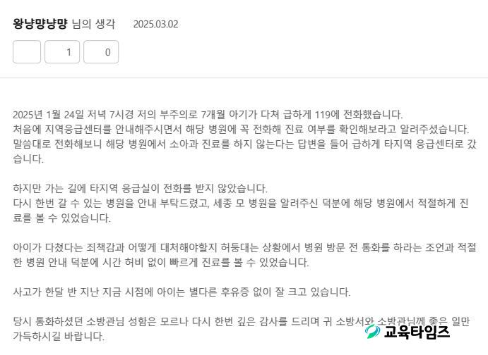 ¶Ç °°Àº ´Þ 24ÀÏ ¿ÀÈÄ 7½Ã 10ºÐ°æ¿¡´Â ħ´ë¿¡¼ 7°³¿ù ¾Æ±â°¡ ¶³¾îÁ® ÀÀ±Þ½ÇÀ» ¼ö¼Ò¹®ÇÏ´Â ½Å°í ÀüÈ¿¡ ´ëÀÀÇØ µµ³»¸¦ ¹þ¾î³ ¼¼Á¾ Áö¿ª±îÁö ¼Ò¾Æ°ú ¿Ü»ó Áø·á°¡ °¡´ÉÇÑ ÀÀ±Þ½Ç°ú ´çÁ÷ º´¿øÀ» ã¾Æ º´¿ø Á¤º¸¸¦ ¹®ÀÚ¸Þ½ÃÁö·Î Àü¼ÛÇÏ°í ¹ß°ÉÀ½ÀÌ ÇêµÇÁö ¾Êµµ·Ï ³»¿ø Àü Âü°í »çÇ× µîÀ» ¾È³»Çß´Ù.