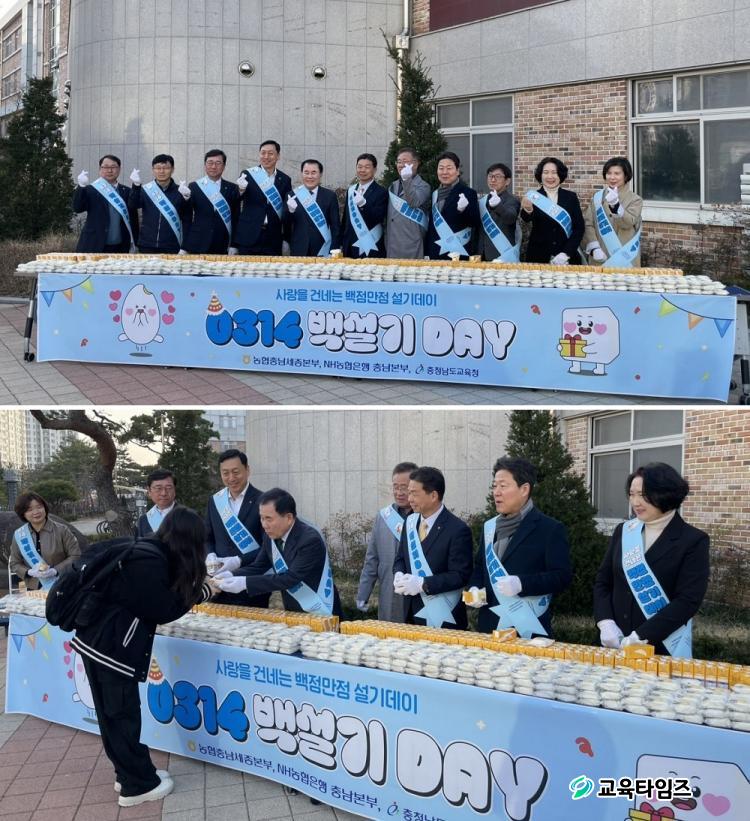 À̳¯ Çà»ç¿¡´Â Ãæ³²±³À°Ã»(±èÁöö ±³À°°¨), ¿¹»ê±³À°Ã»(±èÀº°æ ±³À°°úÀå)°ú ´ö»êÁß(Á¶¸íȯ ±³Àå), Ãæ³²¼¼Á¾º»ºÎ Á÷¿øµéÀÌ Âü¿©ÇÏ¿´À¸¸ç, Çлý°ú ±³Á÷¿øµé¿¡°Ô ¿ì¸®½Ò·Î ¸¸µç ¹é¼³±â¿Í À½·á¸¦ ³ª´©¾î ÁÖ¸ç ¾ÆÄ§¹äÀÇ Á߿伺À» È«º¸Çß´Ù.