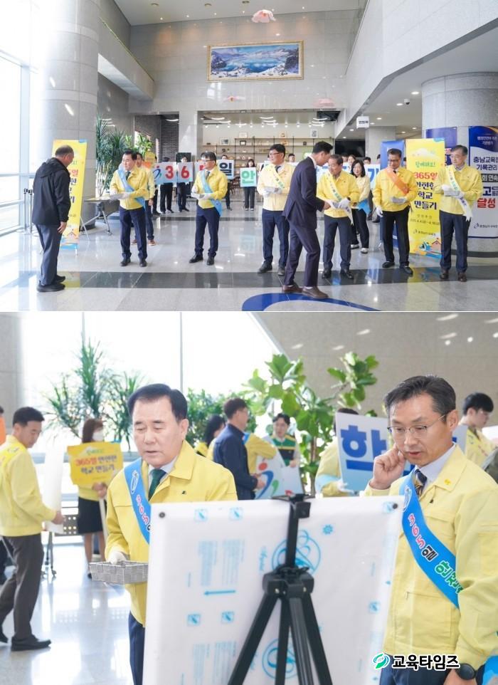 7ÀÏ¿¡´Â ±èÁöö ±³À°°¨À» ºñ·ÔÇÑ °£ºÎ Á÷¿øµéÀÌ ¾ÈÀü ¾î±ú¶ì¸¦ Âø¿ëÇϰí Ãæ³²±³À°Ã» Áß¾ÓÇö°ü¿¡¼ ¼¼¿ùÈ£ Ã߸𸦠À§ÇÑ ³ë¶õ¸®º» ¹èÁö¸¦ ³ª´²ÁÖ¸é¼ ¡®¾ÈÀü ¿¹¹æ ¹× ½ÇõÀ¸·Î ¾ÈÀüÇÑ Çб³¸¦ ¸¸µå´Â µ¥ Á÷¿ø ¸ðµÎ°¡ ÇÔ²² µ¿ÂüÇÏÀÚ¡¯¶ó´Â ¾ÈÀüÀÇÁö¸¦ Àü´ÞÇß´Ù.