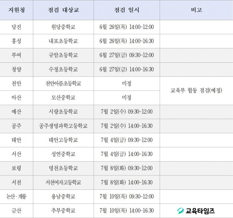 6¿ù 26ÀÏ(¸ñ) ³»Æ÷ÃʵîÇб³(È«¼º)¿Í ¿ø´çÁßÇб³(´çÁø)¸¦ ½ÃÀÛÀ¸·Î, ¿À´Â 7¿ù 10ÀÏ(¸ñ)±îÁö µµ³» 14°³ Çб³¸¦ ´ë»óÀ¸·Î Á¡°ËÀÌ ÁøÇàµÈ´Ù.