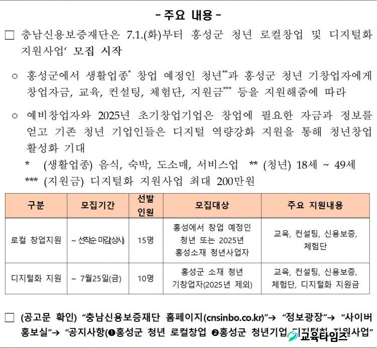 [±³À°Å¸ÀÓÁî/°æÁ¦] °¡µÎÈ£ ±âÀÚ = Ãæ³²½Å¿ëº¸ÁõÀç´Ü(ÀÌ»çÀå Á¶¼ÒÇà, ÀÌÇÏ Ãæ³²½Åº¸)°ú È«¼º±º(±º¼ö ÀÌ¿ë·Ï)Àº 7¿ù 1ÀÏ¡¸È«¼º±º û³â ·ÎÄà â¾÷ ¹× µðÁöÅÐÈ Áö¿ø»ç¾÷¡¹(ÀÌÇÏ Ã»³â Áö¿ø »ç¾÷) Âü¿©ÀÚ ¸ðÁýÀ» ½ÃÀÛÇß´Ù°í ¹àÇû´Ù.