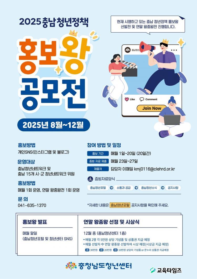 [±³À°Å¸ÀÓÁî/»çȸ] °¡µÎÈ£ ±âÀÚ = Ãæ³²Ã»³â¼¾ÅÍ(¼¾ÅÍÀå °ÇöÁ¤)´Â 2025³â ¿À´Â 8¿ùºÎÅÍ 12¿ù±îÁö ¡®2025 Ãæ³² û³âÁ¤Ã¥ È«º¸¿Õ °ø¸ðÀü¡¯À» °³ÃÖÇÑ´Ù. À̹ø °ø¸ðÀüÀº Ãæ³² û³âµéÀÌ Á÷Á¢ û³âÁ¤Ã¥À» È«º¸Çϰí, À̸¦ ÅëÇØ ´õ ¸¹Àº û³âÀÌ Á¤Ã¥¿¡ °ü½ÉÀ» °¡Áú ¼ö ÀÖµµ·Ï ÇÏ´Â ÃëÁö¿¡¼ ±âȹµÇ¾ú´Ù.