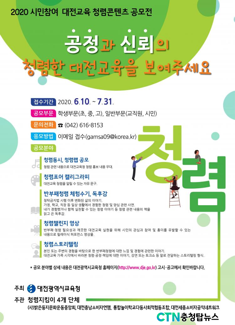 [ÃæÃ»±³À°½Å¹® = Á¤¹ÎÁØ ±âÀÚ] ´ëÀü±¤¿ª½Ã±³À°Ã»Àº ¿À´Â 7¿ù31ÀϱîÁö '°øÁ¤ÇÏ°í ½Å·Ú¹Þ´Â' ´ëÀü±³À° û·Å¹®ÈÁ¶¼ºÀ» À§ÇÏ¿© ´ëÀü ½Ã¹Î°ú ±³À°°¡Á·ÀÌ Âü¿©ÇÏ´Â '2020 ½Ã¹ÎÂü¿© ´ëÀü±³À° û·ÅÄÜÅÙÃ÷ °ø¸ð'¸¦ ½Ç½ÃÇÑ´Ù°í ¹àÇû´Ù.