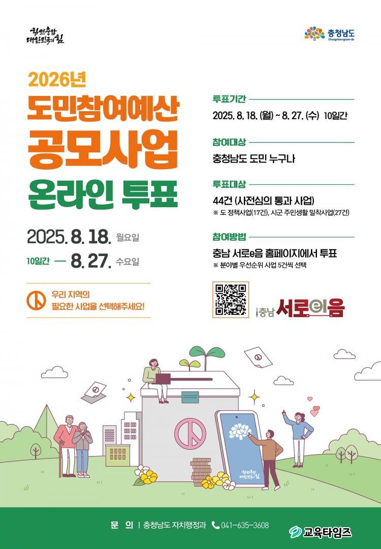 [±³À°Å¸ÀÓÁî/Ãæ³²] °¡µÎÈ£ ±âÀÚ = Ãæ³²µµ´Â ¿À´Â 18ÀϺÎÅÍ 27ÀϱîÁö ¡®2026³â µµ¹ÎÂü¿©¿¹»ê °ø¸ð Á¦¾È»ç¾÷¡¯ ¼±Á¤À» À§ÇÑ ¿Â¶óÀÎ ÅõÇ¥¸¦ ÁøÇàÇÑ´Ù°í 14ÀÏ ¹àÇû´Ù.