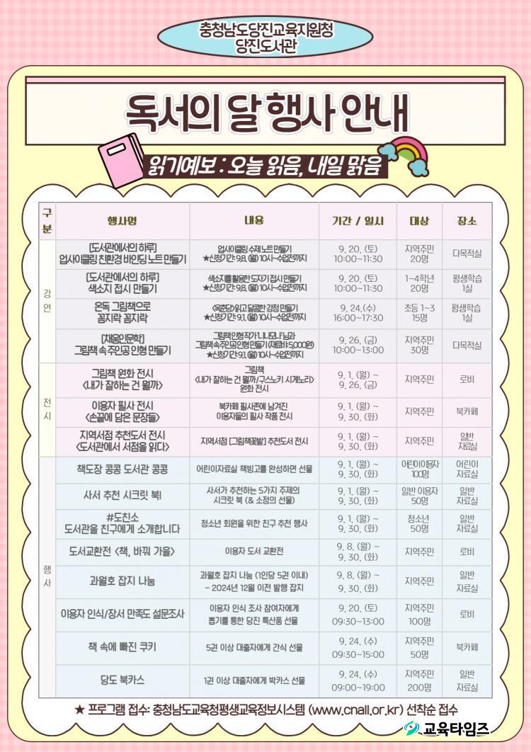 À̹ø µ¶¼ÀÇ ´ÞÀº 'Àб⿹º¸ : ¿À´Ã ÀÐÀ½, ³»ÀÏ ¸¼À½'À̶ó´Â ÁÖÁ¦·Î ÁøÇàµÇ¸ç, µµ¼°ü¿¡¼´Â µ¶¼ÀÇ °¡Ä¡¿Í Çʿ伺À» ¾Ë¸®°í Áö¿ªÁֹεéÀÇ µµ¼°ü ÀÌ¿ë Ȱ¼ºÈ¸¦ À§ÇØ ´Ù¾çÇÑ ÇÁ·Î±×·¥µéÀ» ¼±º¸ÀÏ ¿¹Á¤ÀÌ´Ù.