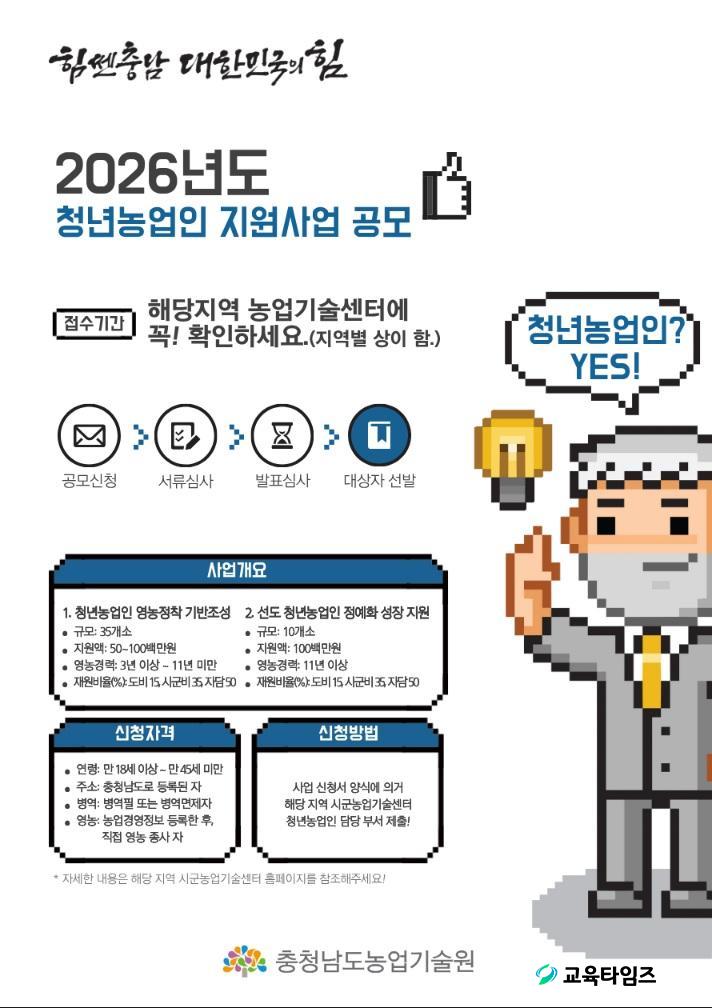 [±³À°Å¸ÀÓÁî/Ãæ³²] °¡µÎÈ£ ±âÀÚ = Ãæ³²µµ ³ó¾÷±â¼ú¿øÀº ¡®2026³â û³â³ó¾÷ÀÎ Áö¿ø»ç¾÷¡¯ °ø¸ð¸¦ ÁøÇà ÁßÀ̶ó°í 9ÀÏ ¹àÇû´Ù.