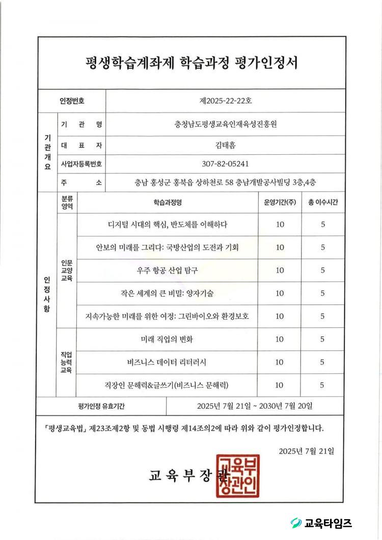 Ãæ³²Æò»ý±³À°ÀÎÀçÀ°¼ºÁøÈï¿ø Æò»ýÇнÀ°èÁÂÁ¦ ÇнÀ°úÁ¤ Æò°¡ÀÎÁ¤¼ /»çÁø=Ãæ³²Æò»ý±³À°ÀÎÀçÀ°¼ºÁøÈï¿ø Á¦°ø
