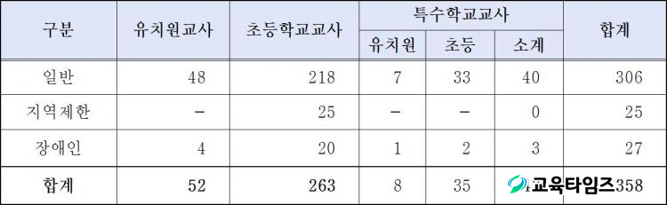 µµ±³À°Ã»Àº ÀÓ¿ëÈĺ¸ÀÚ ¼±Á¤°æÀï½ÃÇèÀ» ÅëÇØ À¯Ä¡¿ø ±³»ç 52¸í, Ãʵ»ç 263¸í, Ư¼öÇб³(À¯¡¤ÃÊ) ±³»ç 43¸í µî ÃÑ 358¸íÀÇ ½Å±Ô±³»ç¸¦ ¼±¹ßÇÒ ¿¹Á¤ÀÌ´Ù. À̹ø ¼±¹ß °èȹÀº Áö³ÇØ ¼±¹ß Àοø ´ëºñ 66¸íÀÌ Áõ°¡ÇÑ °ÍÀ̸ç, ¼¼ºÎ ³»¿ëÀ¸·Î´Â Ãʵ»ç 13¸í, À¯Ä¡¿ø±³»ç 33¸í, Ư¼öÇб³±³»ç 20¸íÀÌ °¢°¢ Áõ°¡ÇÏ¿´´Ù.