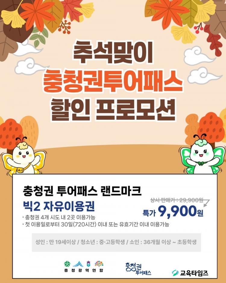 ÃæÃ»±ÇÅõ¾îÆÐ½º´Â ´ëÀü¡¤¼¼Á¾¡¤ÃæºÏ¡¤Ãæ³² 4°³ ½Ã¡¤µµÀÇ ÁÖ¿ä °ü±¤Áö¸¦ ÇϳªÀÇ ÆÐ½º·Î Æí¸®ÇÏ°Ô Áñ±æ ¼ö ÀÖ´Â ÅëÇÕ ÀÌ¿ë±ÇÀÌ´Ù. Æò»ó½Ã¿¡µµ °ü±¤Áö Á¤»ó ¿ä±Ý ´ëºñ ¾à 50% Àú·ÅÇÏ°Ô ÀÌ¿ëÇÒ ¼ö ÀÖ´Â ÇÕ¸®ÀûÀÎ °ü±¤»óǰÀÌ¸é¼ Àüü °¡¸ÍÁ¡ Áß À̿밴ÀÌ ¿øÇÏ´Â °ü±¤Áö¸¦ ÀÚÀ¯·Ó°Ô ¼±ÅÃÇÒ ¼ö ÀÖ´Â ÀåÁ¡ÀÌ ÀÖ´Ù. À̹ø ÇÁ·Î¸ð¼Ç¿¡¼´Â ÃæÃ»±ÇÅõ¾îÆÐ½º ¡®ºò2(2°÷ ÀÌ¿ë±Ç)¡¯ »óǰÀ» Á¤»ó°¡ 29,900¿ø¿¡¼ 2¸¸¿ø ÇÒÀÎµÈ 9,900¿ø¿¡ Á¦°øÇÑ´Ù. ÆÇ¸Å ¼ö·®Àº ÃÑ 3õ ¸Å ÇÑÁ¤À̸ç, 9¿ù 26ÀϺÎÅÍ 10¿ù 12ÀϱîÁö ³×À̹ö ½º¸¶Æ®½ºÅä¾î¸¦ ÅëÇØ ±¸¸ÅÇÒ ¼ö ÀÖ´Ù. »ç¿ë ±âÇÑÀº 10¿ù 31ÀϱîÁö´Ù.