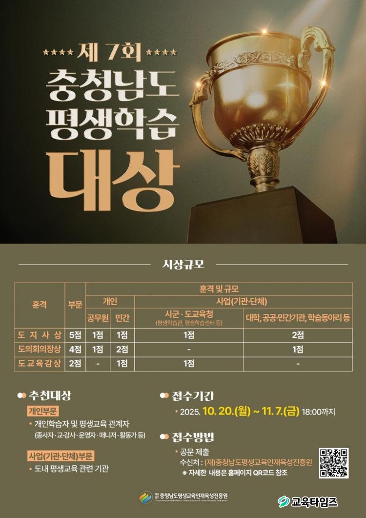 [±³À°Å¸ÀÓÁî/»çȸ] °¡µÎÈ£ ±âÀÚ = Ãæ³²Æò»ý±³À°ÀÎÀçÀ°¼ºÁøÈï¿ø(¿øÀå ȲȯÅÃ)Àº¡®2025³â Á¦7ȸ Ãæ³² Æò»ýÇнÀ´ë»ó¡¯Ç¥Ã¢ °ø¸ð¸¦ ½Ç½ÃÇÑ´Ù°í 23ÀÏ ¹àÇû´Ù. À̹ø °ø¸ð´Â Æò»ýÇнÀ¿¡ ´ëÇÑ ¿Á¤°ú Çå½ÅÀ¸·Î Áö¿ª»çȸ ÇнÀ¹®È È®»ê¿¡ ±â¿©ÇÑ µµ¹Î°ú ±â°ü¡¤´Üü¸¦ ¹ß±¼ÇØ ±× °ø·Î¸¦ ³Î¸® ¾Ë¸®°íÀÚ ÃßÁøµÈ´Ù.