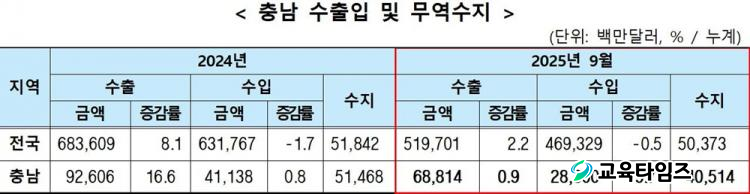 ¡®2025³â 9¿ù ÃæÃ»³²µµ ¼öÃâÀÔ µ¿Çâ º¸°í¡¯¿¡ µû¸£¸é, 9¿ù ¼öÃâ¾×(´©°è)Àº 688¾ï ´Þ·¯, ¼öÀÔ¾×(´©°è)Àº 283¾ï ´Þ·¯¸¦ ±â·ÏÇØ ¹«¿ª¼öÁö(´©°è) 405¾ï ´Þ·¯ ÈæÀÚ¸¦ ´Þ¼ºÇß´Ù.