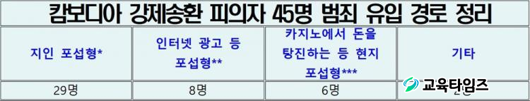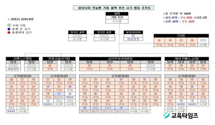 °æÂû¿¡ µû¸£¸é, Ãæ³²°æÂûûÀº Áö³ 7¿ù 5ÀÏ Ä¯º¸µð¾Æ ÇÁ³ðÆæ ÇöÁö ´ç±¹°ú °øÁ¶ÇÏ¿© ¹üÁË´ÜÁö¸¦ ±Þ½À, ÇÇÀÇÀÚ 59¸íÀ» °Ë°ÅÇß´Ù. ÀÌ Áß 45¸í¿¡ ´ëÇØ üÆ÷¿µÀåÀ» ¹ßºÎ¹Þ¾Æ 10¿ù 18ÀÏ(Çѱ¹ ½Ã°¢ 02:40) įº¸µð¾Æ °øÇ× ³»¿¡¼ üÆ÷¿µÀåÀ» ÁýÇà, ±ä±Þ üÆ÷ ÈÄ ±¹³»·Î ¼ÛȯÇß´Ù. ÀÌÈÄ 10¿ù 20ÀÏ ¹ý¿øÀº Àü¿ø¿¡ ´ëÇØ ±¸¼Ó¿µÀåÀ» ¹ßºÎÇßÀ¸¸ç, ÇÇÀÇÀÚ 45¸í Àü¿øÀº °ËÂû¿¡ ¼ÛÄ¡µÆ´Ù.