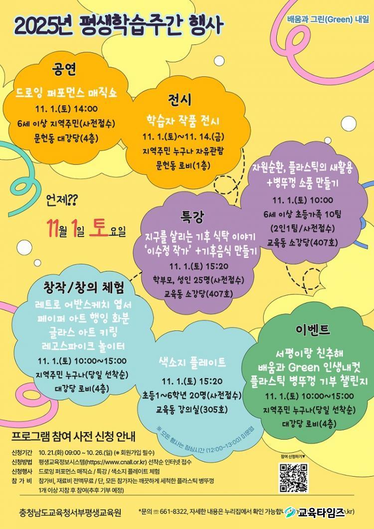 [±³À°Å¸ÀÓÁî/Ãæ³²±³À°] ÇѼºÁø ±âÀÚ = ÃæÃ»³²µµ±³À°Ã»¼­ºÎÆò»ý±³À°¿ø(¿øÀå Á¶±ÇÈ£)Àº 11¿ù 1ÀÏ(Åä)ºÎÅÍ 14ÀÏ(±Ý)±îÁö '2025 Æò»ýÇнÀÁÖ°£'À» ¿î¿µÇϸç, Áö¿ªÁֹΰú ÇÔ²² ¹è¿ì°í ¼ÒÅëÇÏ´Â ´Ùä·Î¿î Çà»ç¸¦ ¼±º¸ÀδÙ.