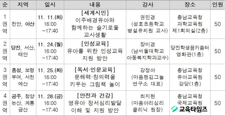 [±³À°Å¸ÀÓÁî/Ãæ³²±³À°] °¡µÎÈ£ ±âÀÚ = Ãæ³²±³À°Ã»(±³À°°¨ ±èÁöö)Àº µµ³» À¯Ä¡¿ø°ú ¾î¸°ÀÌÁý ±³¿øÀ» ´ë»óÀ¸·Î 11¿ù 11ÀÏ(È)ºÎÅÍ 11¿ù 28ÀÏ(±Ý)±îÁö ±Ç¿ªº°·Î ±¸ºÐÇÏ¿© ã¾Æ°¡´Â À¯¾Æ±³À° ±³¿ø ¿¬¼ö¸¦ 4ȸ Áö¿øÇÑ´Ù.