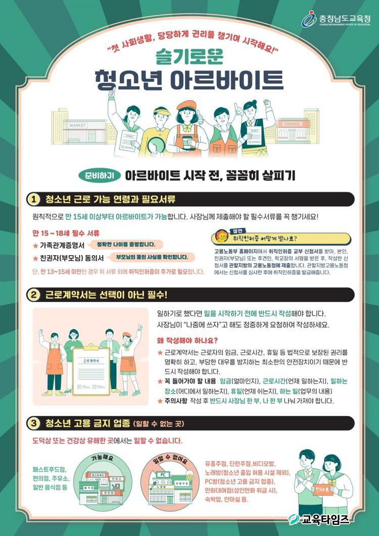 À̹ø ±³À°ÀÚ·á´Â û¼Ò³âµéÀÌ ¾Æ¸£¹ÙÀÌÆ®¸¦ ½ÃÀÛÇϱâ Àü ¹Ýµå½Ã ¾Ë¾Æ¾ß ÇÒ ÇÙ½É ³»¿ëÀ» Áß½ÉÀ¸·Î ±¸¼ºµÆ´Ù. ÁÖ¿ä ³»¿ëÀº ¡ã û¼Ò³â ±Ù·Î °¡´É ¿¬·É°ú Çʿ伷ù ¡ã ±Ù·Î°è¾à¼ ÀÛ¼º ¡ã û¼Ò³â °í¿ë ±ÝÁö ¾÷Á¾ µîÀ» ¾È³»Çϰí, ÀÏÇϴ û¼Ò³âÀÇ ±Ç¸®¸¦ Áö۱â À§ÇØ ¡ã ÃÖÀúÀÓ±Ý ¡ã ÀÏÇÏ´Â ½Ã°£°ú ½¬´Â ½Ã°£ ¡ã »êÀç¿Í ¼ºÈñ·Õ ¿¹¹æÀ» À§ÇÑ ÀÚ·á·Î ±¸¼ºµÇ¾ú´Ù.