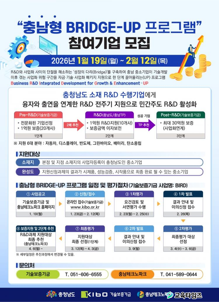[±³À°Å¸ÀÓÁî/Ãæ³²] °¡µÎÈ£ ±âÀÚ = Ãæ³²µµ´Â ±â¼úº¸Áõ±â±Ý, Ãæ³²Å×Å©³ëÆÄÅ©¿Í ÇÔ²² ¼ÒºÎÀ塤Áß¼Ò±â¾÷ ¼ºÀå Áö¿øÀ» À§ÇÑ Ãæ³²Çü ±â¾÷ ¸ÂÃã Áö¿ø»ç¾÷(BRIDGE-UP ÇÁ·Î±×·¥ºê¸´Áö-¾÷ ÇÁ·Î±×·¥(BRIDGE-UP, Business R&D Integrated Development for Growth & Enhancement))À» ÃßÁøÇÑ´Ù°í 14ÀÏ ¹àÇû´Ù.