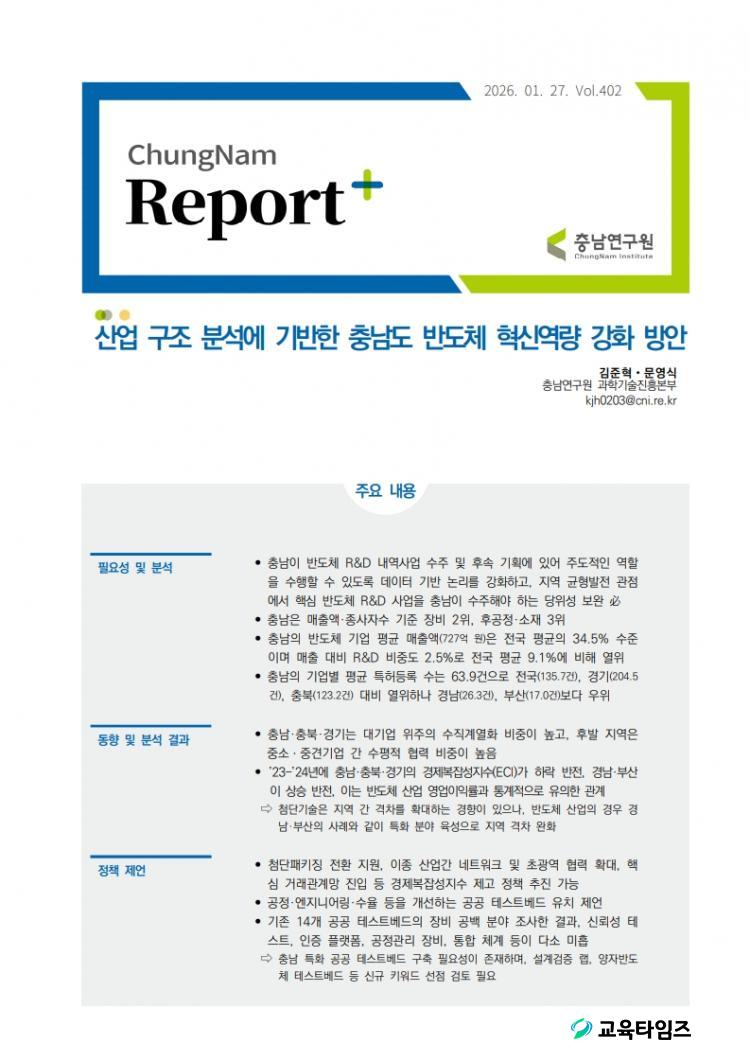 ¿¬±¸ÁøÀº ¡°½ÇÁ¦ Áö¿ª »ê¾÷±¸Á¶¸¦ ¹Ý¿µÇØ »êÃâÇÑ °æÁ¦º¹À⼺Áö¼ö(ECI) ºÐ¼® °á°ú, ¹ÝµµÃ¼ »ê¾÷¿¡¼µµ Áö¿ª Æ¯È Àü·«ÀÌ Çõ½Å¼º°ú¿Í ¿µ¾÷ÀÌÀÍ·ü °³¼±À¸·Î À̾îÁú ¼ö ÀÖÀ½À» º¸¿©Áá´Ù¡±¸ç ¡°Ãæ³² ¹ÝµµÃ¼ Çõ½Å¿ª·® Á¦°í¸¦ À§ÇØ ¡ã÷´ÜÆÐŰ¡ Àüȯ Áö¿ø ¡ãÀÌÁ¾ »ê¾÷ °£ ³×Æ®¿öÅ© ¹× Ãʱ¤¿ª Çù·Â È®´ë ¡ãÇÙ½É °Å·¡°ü°è¸Á ÁøÀÔ Áö¿ø ¡ãÃæ³² Æ¯È °ø°ø Å×½ºÆ®º£µå ±¸Ãà µî 4´ë Á¤Ã¥ ÆÐŰÁö¸¦ Á¦¾ÈÇÑ´Ù¡±°í ¸»Çß´Ù.