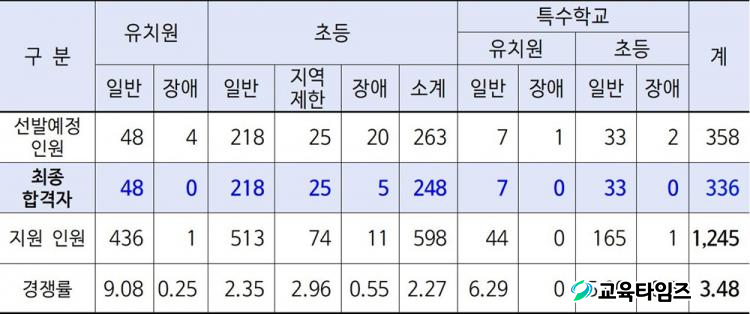 ÃÖÁ¾ÇÕ°ÝÀÚ 336¸íÀº À¯Ä¡¿ø ±³»ç 48¸í, ÃʵîÇб³ ±³»ç(Áö¿ªÁ¦ÇÑ 25¸í Æ÷ÇÔ) 248¸í, Ư¼öÇб³(À¯Ä¡¿ø) ±³»ç 7¸í, Ư¼öÇб³(Ãʵî) ±³»ç 33¸íÀÌ´Ù.
