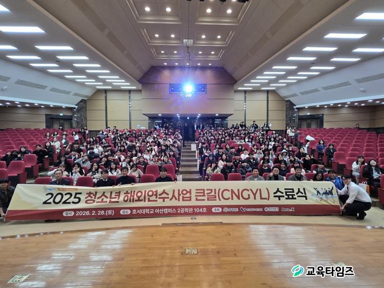 [±³À°Å¸ÀÓÁî/»çȸ] °¡µÎÈ£ ±âÀÚ = Ãæ³²Æò»ý±³À°ÁøÈï¿øÀº ¡¸2025³â Ãæ³² û¼Ò³â ÇØ¿Ü¿¬¼ö ¡®Å«±æ(CNGYL)¡¯ ÇÁ·Î±×·¥¡¹ 5±â ¿¬¼ö¸¦ ¼º°ø¸®¿¡ ¸¶Ä¡°í, ¿¬¼ö»ý ¹× Çкθð µî ¾à 430¸íÀÌ Âü¼®ÇÑ °¡¿îµ¥ ¼ö·á½Ä ¹× ¼º°ú°øÀ¯È¸¸¦ 2¿ù 28ÀÏ È£¼´ëÇб³ ¾Æ»êÄ·ÆÛ½º¿¡¼ °³ÃÖÇß´Ù.
