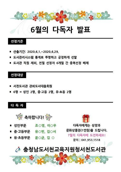 6¿ùÀÇ ´Ùµ¶Àڷδ ¼ºÀκι® Á¶¾Æ¿µ, À̼º¿ì, Áß¡¤°íµîºÎ¹® À¯´Ùºó, ±è¹Î¼, À¯¡¤ÃʵîºÎ¹® À±µµ±Õ, ±èÀ² ÇлýÀÌ ¼±Á¤µÆ´Ù.