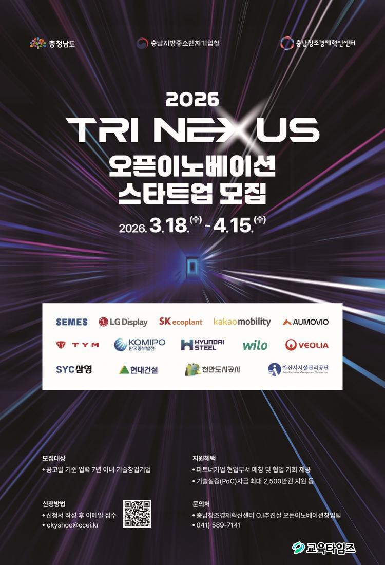 [±³À°Å¸ÀÓÁî/°æÁ¦] °¡µÎÈ£ ±âÀÚ = (Àç)Ãæ³²Ã¢Á¶°æÁ¦Çõ½Å¼¾ÅÍ(ÀÌÇÏ Ãæ³²Çõ½Å¼¾ÅÍ)´Â ´ë¡¤Áß°ß±â¾÷(°ø±â¾÷)°ú ½ºÅ¸Æ®¾÷ °£ ¿ÀÇÂÀ̳뺣À̼ÇÀ» ÅëÇØ Çõ½Å±â¼úÀÇ »ê¾÷ Àû¿ë°ú »ç¾÷È­¸¦ Áö¿øÇÏ´Â ¡®2026 Tri Nexus ¿ÀÇÂÀ̳뺣À̼ǡ¯ ÇÁ·Î±×·¥¿¡ Âü¿©ÇÒ ½ºÅ¸Æ®¾÷À» ¿À´Â 4¿ù 15ÀϱîÁö ¸ðÁýÇÑ´Ù°í ¹àÇû´Ù.