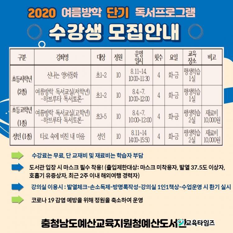 ¶ÇÇÑ ¹æÇÐÀ» ¸ÂÀÌÇÏ¿© 8¿ù 4ÀϺÎÅÍ 8¿ù 14ÀϱîÁö ÃʵîÇлý ¹× Áö¿ªÁֹΠ´ë»ó ´Ü±â µ¶¼ ÇÁ·Î±×·¥ ¿î¿µÇÑ´Ù. Ãʵî»ý ´ë»ó ¡ã¿©¸§¹æÇÐ µ¶¼±³½Ç-ÇϺê·çŸ 2Á¾(Ãʵî1~2Çгâ, 3~5Çгâ) ¡ã½Å³ª´Â ¿µ¾îµ¿È(Ãʵî 1~2Çгâ) 1Á¾, ¼ºÀδë»ó ¡ãŸ·Î ¼Ó¿¡ ºñÄ£ ³» ¸¶À½ °Á 1Á¾ÀÌ ÁøÇàµÉ ¿¹Á¤ÀÌ´Ù. Ư° ½ÅûÀº ¿À´Â 16ÀϺÎÅÍ Æò»ýÇнÀÁ¾ÇÕÁ¤º¸½Ã½ºÅÛÀ» ÅëÇØ ¿Â¶óÀÎ Á¢¼ö °¡´ÉÇÏ´Ù.