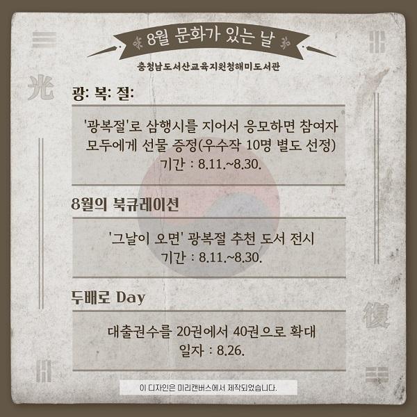 [ÃæÃ»±³À°½Å¹® = °¡±ÝÇö ±âÀÚ] ÃæÃ»³²µµ¼»ê±³À°Áö¿øÃ»Çع̵µ¼°ü(°üÀå À̳²¹Ì)Àº ¹®È°¡ ÀÖ´Â ³¯À» ¸ÂÀÌÇØ 8¿ù 11ÀϺÎÅÍ '±¤: º¹: Àý:' µî ´Ù¾çÇÑ µ¶¼ Çà»ç¸¦ ¿î¿µÇÑ´Ù.