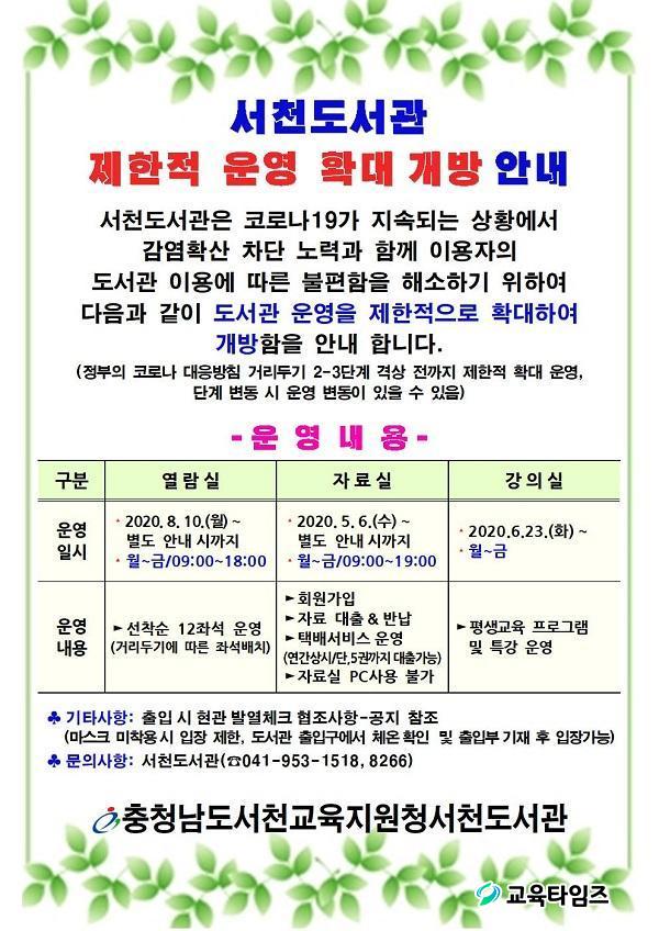 µµ¼°ü ¿¶÷½Ç ¹× ÀÚ·á½Ç ¿î¿µ°ú Æò»ý±³À° ÇÁ·Î±×·¥ ¿î¿µ¿¡ °üÇÑ ÀÚ¼¼ÇÑ ³»¿ëÀº ¼Ãµµµ¼°ü ´©¸®Áý(https://sclib.cne.go.kr/)¶Ç´Â ÀüÈ(¢Ï 041-953-1518, 8266)·Î ¹®ÀÇÇϸé ÀÚ¼¼ÇÏ°Ô ¾È³» ¹ÞÀ» ¼ö ÀÖ´Ù.