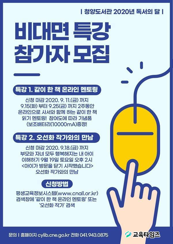 [ÃæÃ»±³À°½Å¹® = ÀÓÁ¾º¹ ±âÀÚ] ÃæÃ»³²µµÃ»¾ç±³À°Áö¿øÃ»Ã»¾çµµ¼°ü(ÀÌÇÏ 'û¾çµµ¼°ü')Àº 2020³â µ¶¼ÀÇ ´ÞÀ» ¸Â¾Æ ºñ´ë¸é ÇÁ·Î±×·¥ <°°ÀÌ ÇÑ Ã¥ ¿Â¶óÀÎ ¸àÅ丵>, <ºñ´ë¸é ¿À¼±È ÀÛ°¡¿ÍÀÇ ¸¸³²>À» ¿î¿µÇÑ´Ù.
