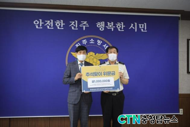 [ÃæÃ»±³À°½Å¹® = ¹æ¹ÌÈñ ±âÀÚ] °æ»ó³²µµÁøÁÖ±³À°Áö¿øÃ»(±³À°Àå ÇãÀμö)Àº 22ÀÏ ÁøÁּҹ漸¦ ¹æ¹®ÇÏ¿© Áö¿ª ¾ÈÀüÀ» À§ÇØ ¾Ö¾²°í ÀÖ´Â ¼Ò¹æ°ü°èÀڵ鿡°Ô ±×°£ÀÇ ³ë°í¸¦ À§·ÎÇϰí À§¹®±ÝÀ» Àü´ÞÇß´Ù.