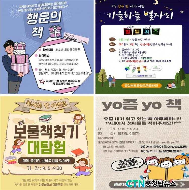 [ÃæÃ»±³À°½Å¹® = ¹Úö¿ì ±âÀÚ] ÃæÃ»ºÏµµÁß¿ø±³À°¹®È¿ø(¿øÀå ¾öº´¿ë)Àº µ¶¼ÀÇ °èÀýÀÎ °¡À»À» ¸ÂÀÌÇÏ¿© µµ¼°üÀ» ¹æ¹®ÇÏÁö ¾Ê°íµµ ´Ù¾çÇÏ°Ô Áñ±æ ¼ö ÀÖ´Â ¿Â¶óÀÎ µ¶¼¹®È Çà»ç, µµ¼ ¹«·á¹è¼Û ¼ºñ½º¸¦ ºñ·ÔÇÑ ºñ´ë¸é ¹æ½ÄÀÇ ´ëÃâ ¼ºñ½º¸¦ 9¿ù~10¿ù ÁßÀ¸·Î ¿î¿µ ÇÑ´Ù°í ¹àÇû´Ù.