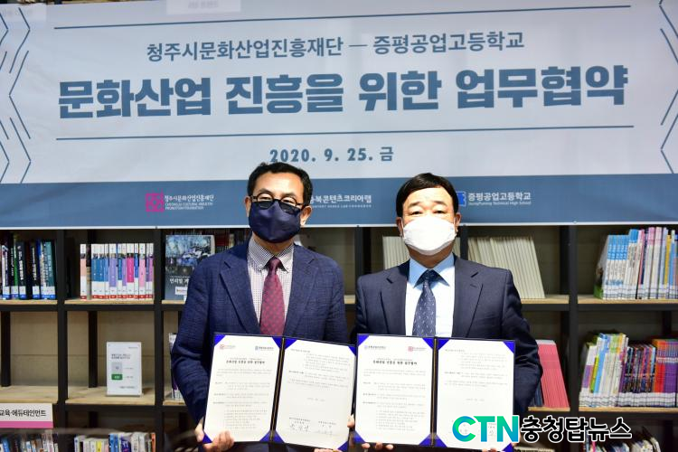 [ÃæÃ»±³À°½Å¹® = ¹Úö¿ì ±âÀÚ] ÁõÆò°ø¾÷°íµîÇб³(±³Àå ÀÌÀ±±¸)¿Í ûÁֽù®È»ê¾÷ÁøÈïÀç´Ü(»ç¹«ÃÑÀå ¹Ú»ó¾ð)ÀÌ 9¿ù 25ÀÏ(±Ý) ¿ÀÀü 10½Ã ÃæºÏÄÜÅÙÃ÷ÄÚ¸®¾Æ·¦¿¡¼ ÃæÃ»ºÏµµ ¹®È»ê¾÷ ¹ßÀü°ú ÁøÈïÀ» À§ÇÏ¿© »óÈ£ °£ ±³·ù Çù·Âü°è¸¦ ±¸ÃàÇÏ´Â Çù¾à½ÄÀ» °³ÃÖÇß´Ù°í ¹àÇû´Ù.