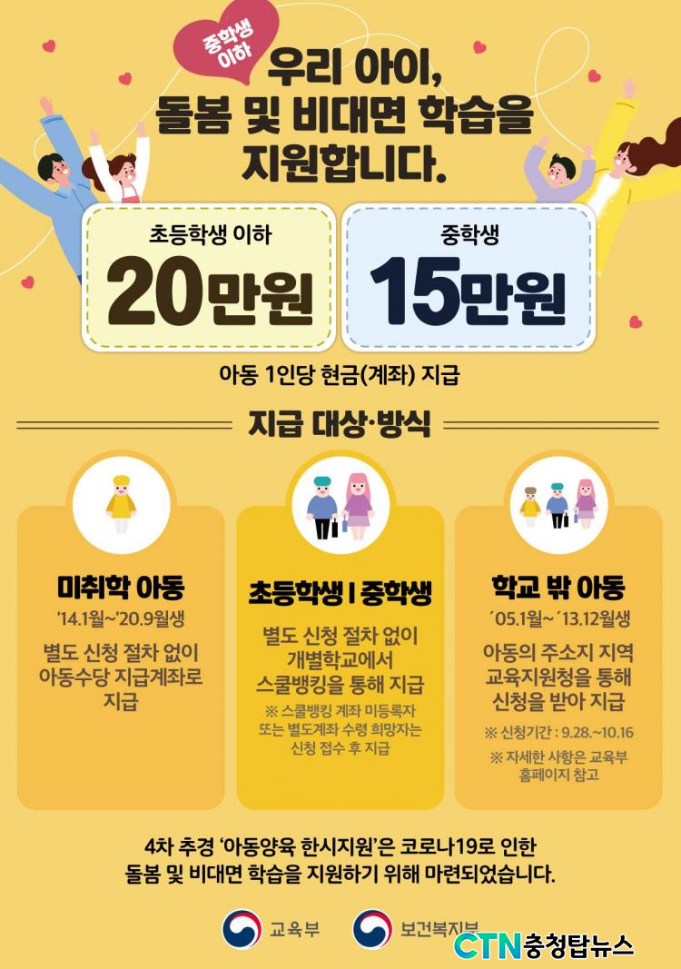 [ÃæÃ»±³À°½Å¹® = ¹Úö¿ì ±âÀÚ] ÃæÃ»ºÏµµ±³À°Ã»(±³À°°¨ ±èº´¿ì)Àº Äڷγª19·Î ÀÎÇÑ ÃʵîÇлý ´ë»ó ¾Æµ¿ µ¹º½ ¹× ÁßÇб³ ´ë»ó ºñ´ë¸é ÇнÀ¿¡ µû¸¥ ¾Æµ¿ ¾çÀ° °¡Á¤ÀÇ °æÁ¦Àû ºÎ´ã °æ°¨À» À§ÇÑ ÃʵîÇлý ¾Æµ¿ Ưº° µ¹º½Áö¿ø±ÝÀ» ¿À´Â 9¿ù 29ÀÏ(È)±îÁö, ÁßÇлý ºñ´ë¸é ÇнÀÁö¿ø±Ýµµ ¿À´Â 10¿ù 8ÀÏ(¸ñ)±îÁö Áö¿øÇÒ °èȹÀ̶ó°í ¹àÇû´Ù.