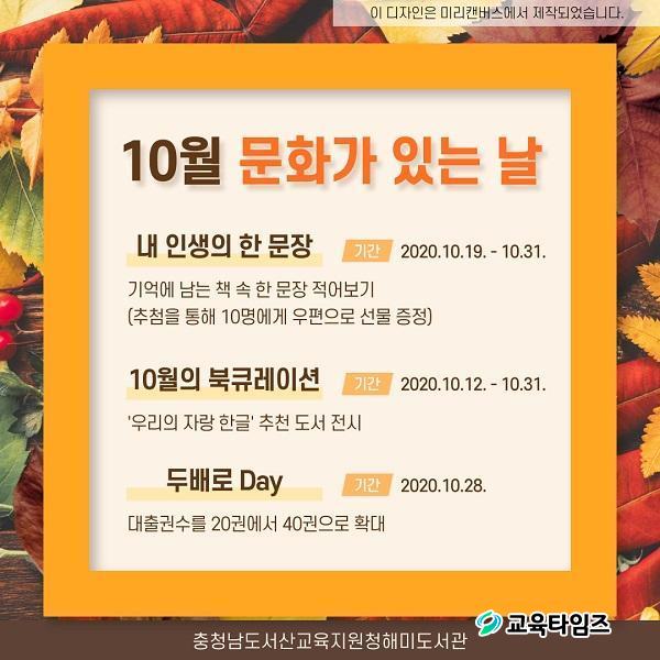 [ÃæÃ»±³À°½Å¹® = °¡±ÝÇö ±âÀÚ] ÃæÃ»³²µµ¼»ê±³À°Áö¿øÃ»Çع̵µ¼°ü(°üÀå À̳²¹Ì)Àº ¹®È°¡ ÀÖ´Â ³¯À» ¸ÂÀÌÇØ 10¿ù 12ÀϺÎÅÍ '³» ÀλýÀÇ ÇÑ ¹®Àå' µî ´Ù¾çÇÑ µ¶¼ Çà»ç¸¦ ¿î¿µÇÑ´Ù.