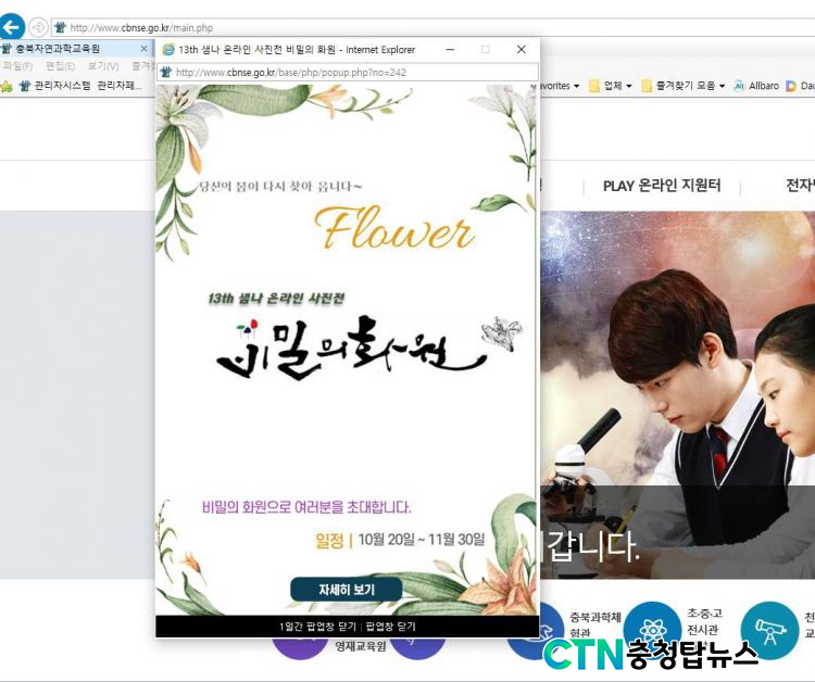 [CTN ÃæÃ»±³À°½Å¹® = ¹Úö¿ì ±âÀÚ] ÃæÃ»ºÏµµÀÚ¿¬°úÇб³À°¿ø(¿øÀå ¹ÚÀçȯ)Àº °úÇб³»çÀÚÀ²µ¿¾Æ¸® '»ù³ª'°¡ 'ºñ¹ÐÀÇ È¿ø'À̶ó´Â ÁÖÁ¦·Î Á¦ÀÛµÈ ÀüÀÚÇö¹Ì°æ »çÁøÀ» ¿Â¡¤¿ÀÇÁ¶óÀÎÀ¸·Î º´ÇàÇØ Á¦°øÇϰí ÀÖ´Ù°í ¹àÇû´Ù.